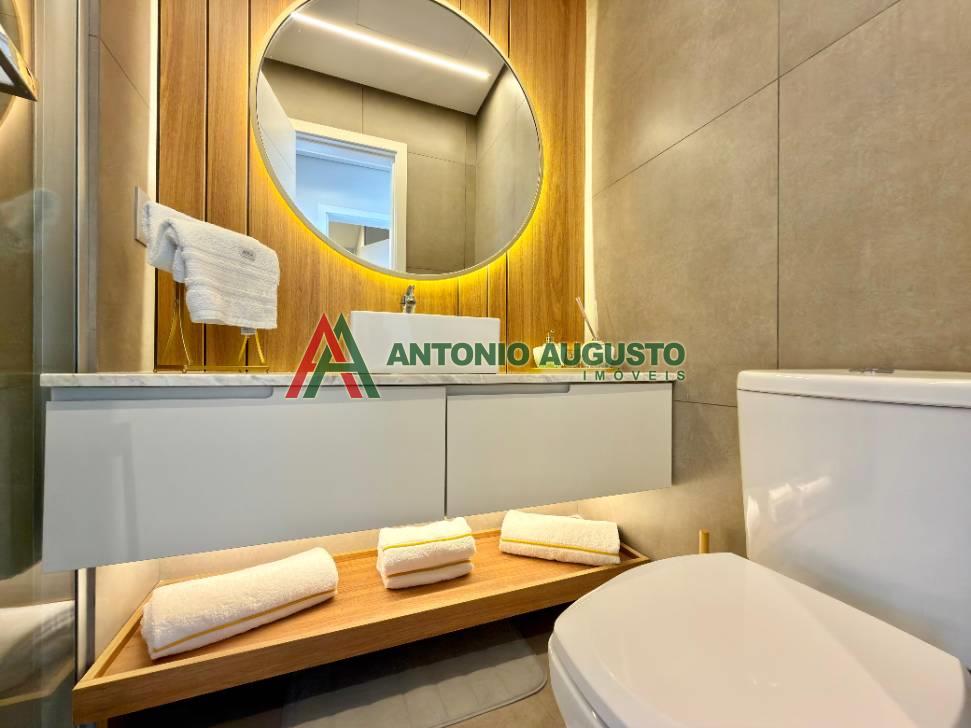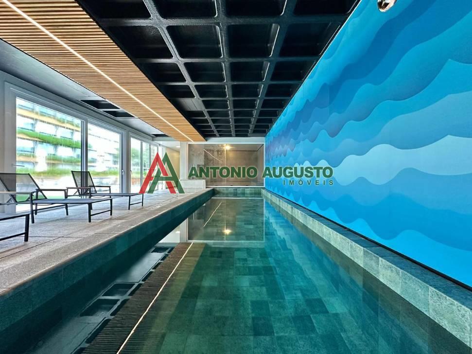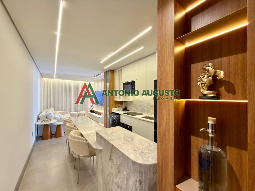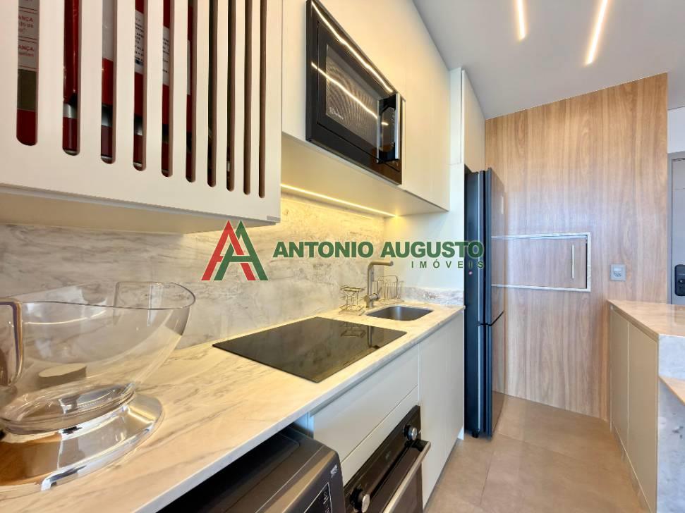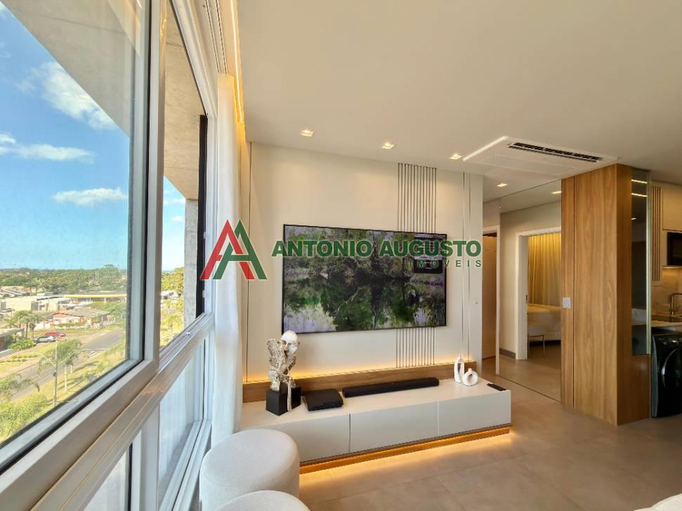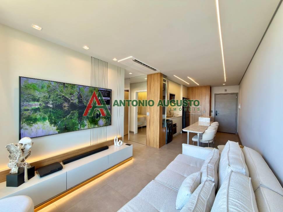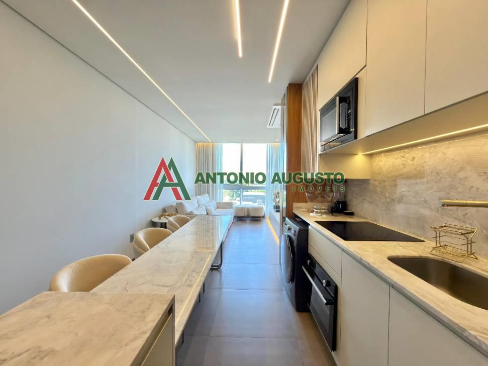 Fino apartamento mobiliado e decorado com área privativa 597,69m², constituído de 02 dormitórios sendo 01 Suíte, banheiro social, climatização completa no living e nos dormitórios, posição solar Leste e Norte, living integrado com sala de estar, jantar com churrasqueira, cozinha com bancada gourmet, Box Duplo de garagem amplo Nº05, lavanderia com lava e seca, sacada de frente com vista Mar.
